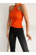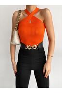 Kadin Damla Pencere Detayli Boyundan Gecmeli Triko Crop Bluz Turuncu BLZ0014