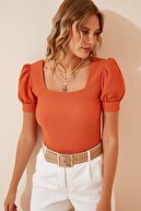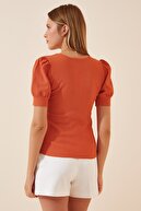 Kadin Koyu Oranj Kare Yaka Balon Kollu Örme Bluz DD01051